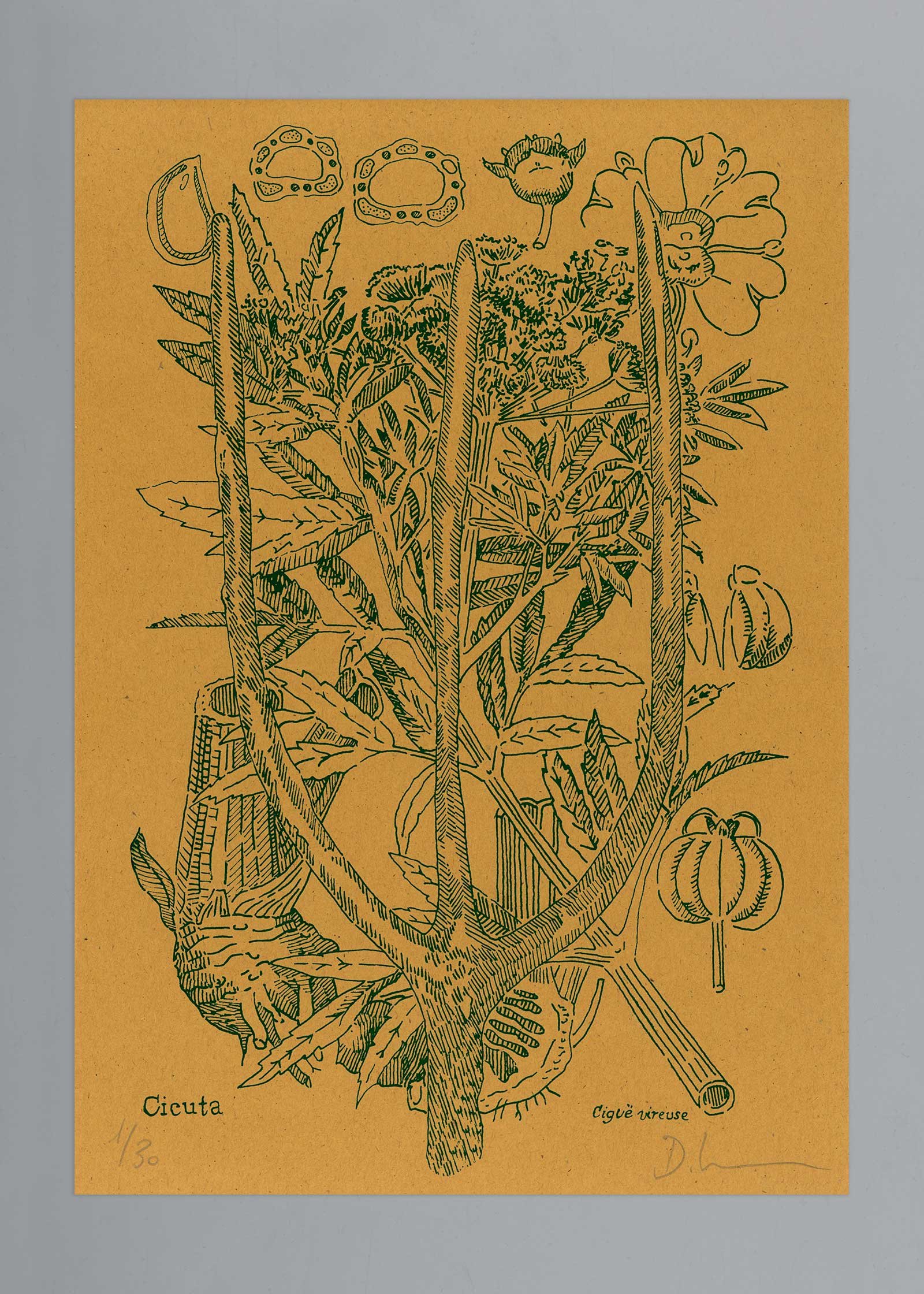 Sérigraphie imprimée en vert foncé sur papier kraft dans l'atelier du collectif Aristide à Assens. Encre à l'eau. Série limitée à 30 exemplaires, numérotés et signés par l'artiste. Format : 21 x 29.7 cm (A4) 2025